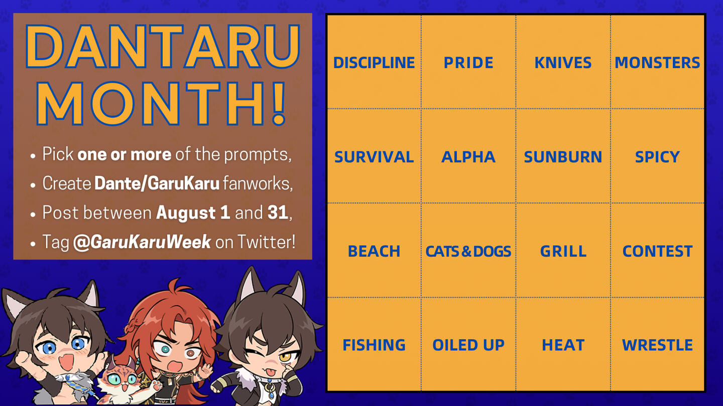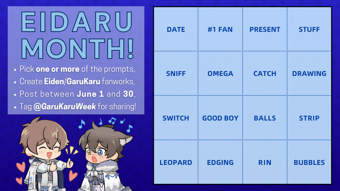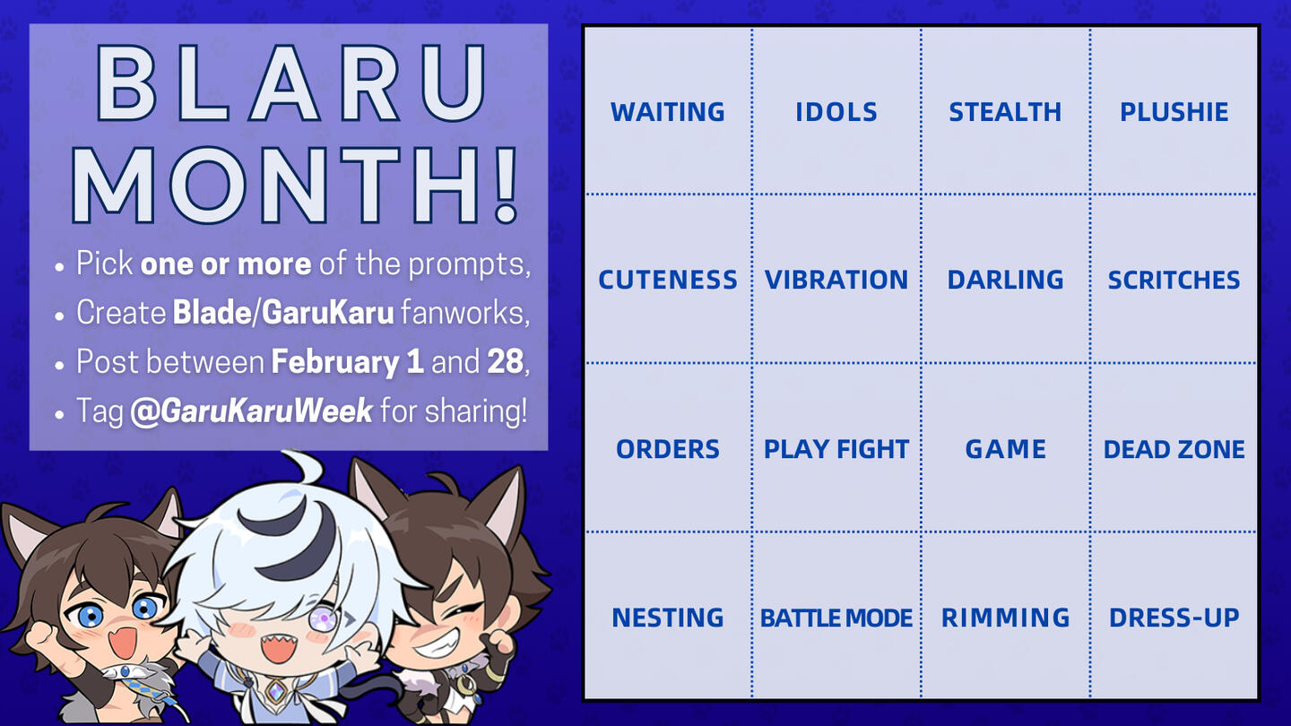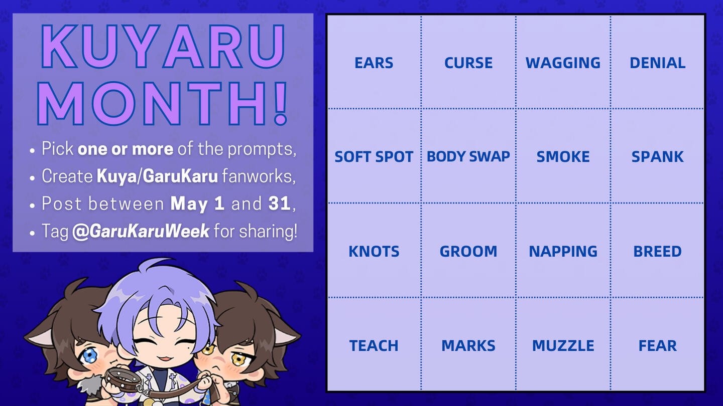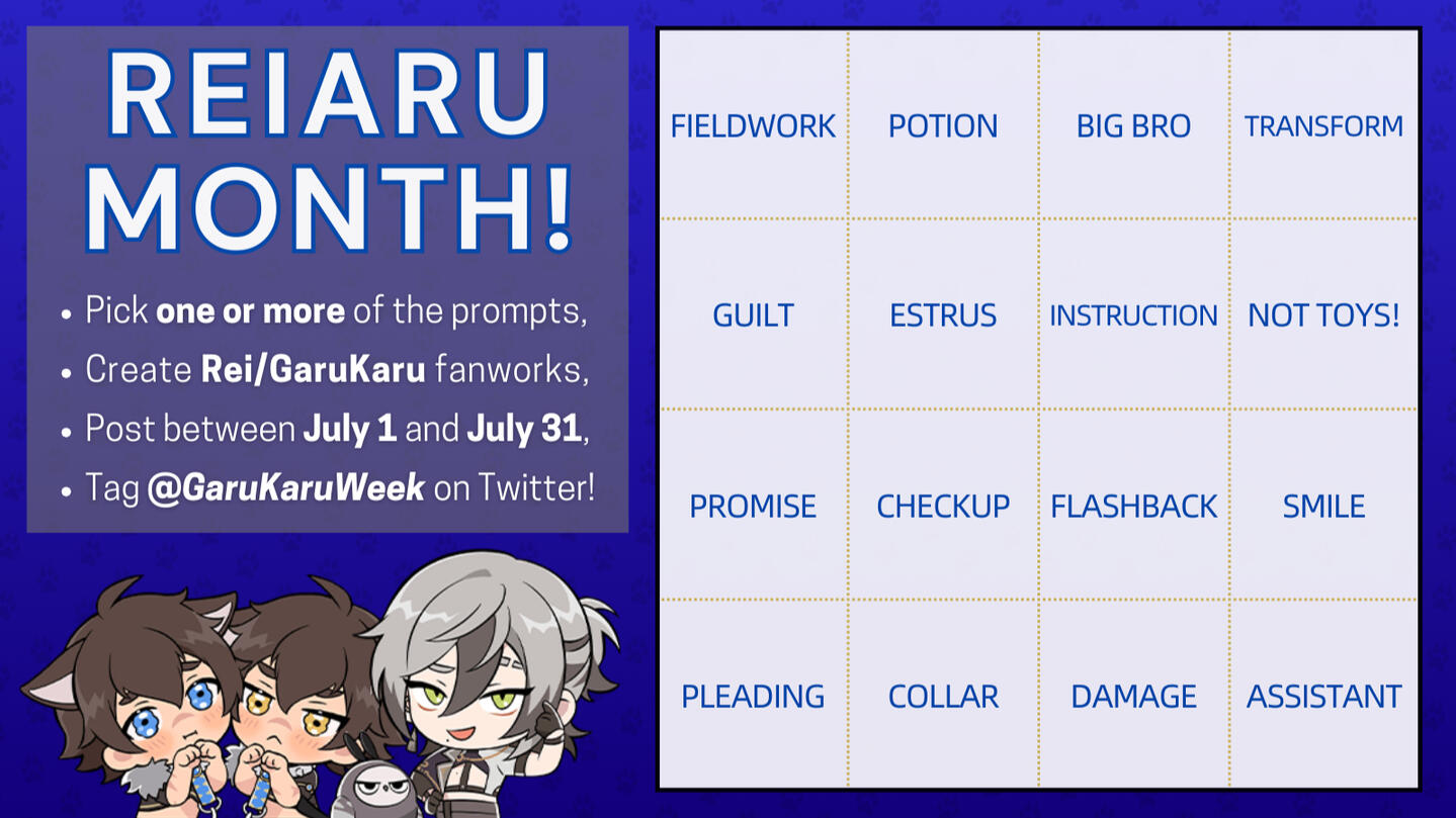 From July 2024 to June 2025, we provided monthly lists of prompts focused on the dynamic between Garu, Karu and a specific NU:Carnival character β that month's birthday boy!Participating was extremely simple: just create a fanwork based on one or more of the listed prompts, and post it during the month. There were no content restrictions, requirements or guidelines beyond featuring the pairing. A fanwork can be of any size, length or skill level; the characters' relationship can be sexual, romantic, or platonic. This is not a challenge or contest, it is merely an incentive to create and to celebrate these rarepairs! Feel free to use these prompts for late submissions, no matter what year it is.Any participating fanwork that we see will be linked in our master spreadsheet. Tagging @GaruKaruWeek when you post is optional. It just helps us find your work and share it! We're on Bluesky as well.Worth mentioning: @nuFlashFic is running drabble-writing events for character birthdays for the foreseeable future! If your fanwork is a tiny fic, consider submitting it to both events. Details and AO3 collection here!