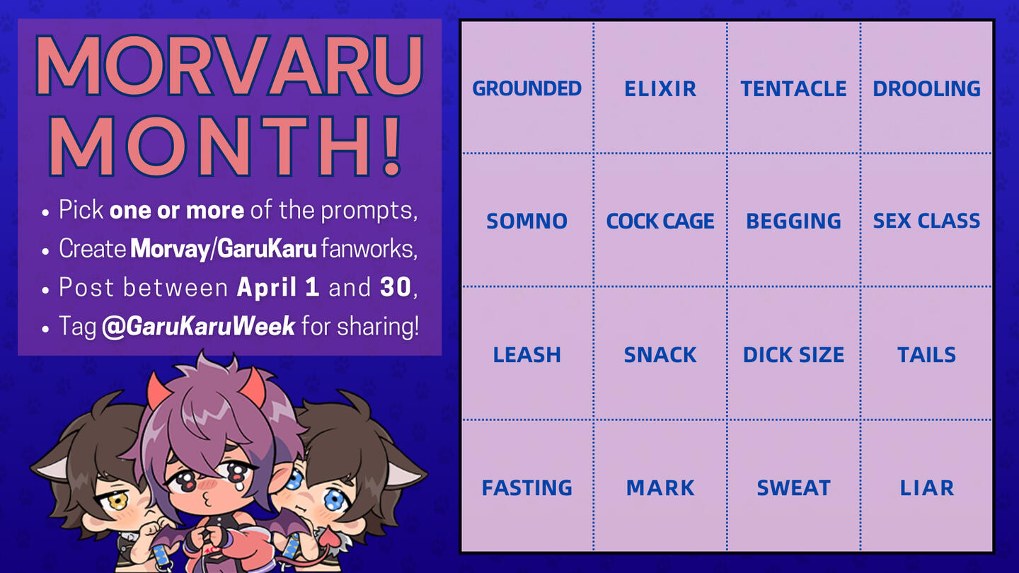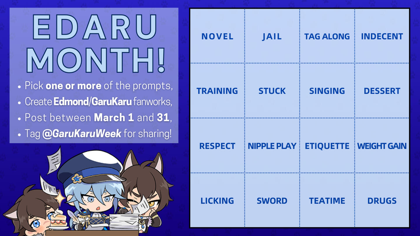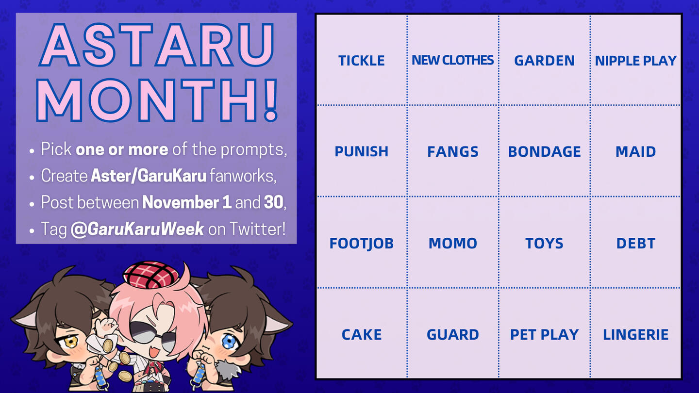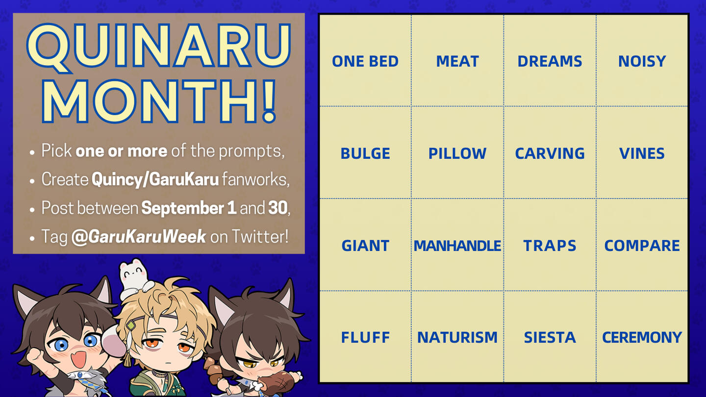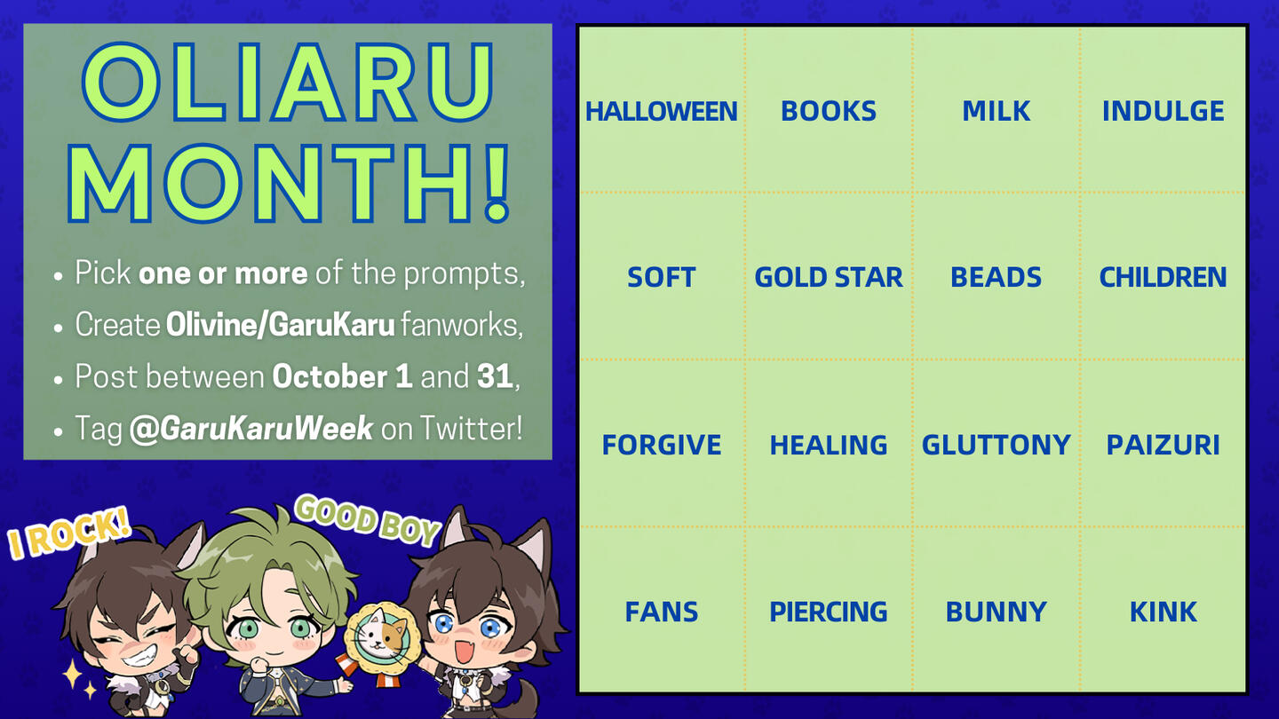 From July 2024 to June 2025, we provided monthly lists of prompts focused on the dynamic between Garu, Karu and a specific NU:Carnival character β that month's birthday boy!Participating was extremely simple: just create a fanwork based on one or more of the listed prompts, and post it during the month. There were no content restrictions, requirements or guidelines beyond featuring the pairing. A fanwork can be of any size, length or skill level; the characters' relationship can be sexual, romantic, or platonic. This is not a challenge or contest, it is merely an incentive to create and to celebrate these rarepairs! Feel free to use these prompts for late submissions, no matter what year it is.Any participating fanwork that we see will be linked in our master spreadsheet. Tagging @GaruKaruWeek when you post is optional. It just helps us find your work and share it! We're on Bluesky as well.Worth mentioning: @nuFlashFic is running drabble-writing events for character birthdays for the foreseeable future! If your fanwork is a tiny fic, consider submitting it to both events. Details and AO3 collection here!