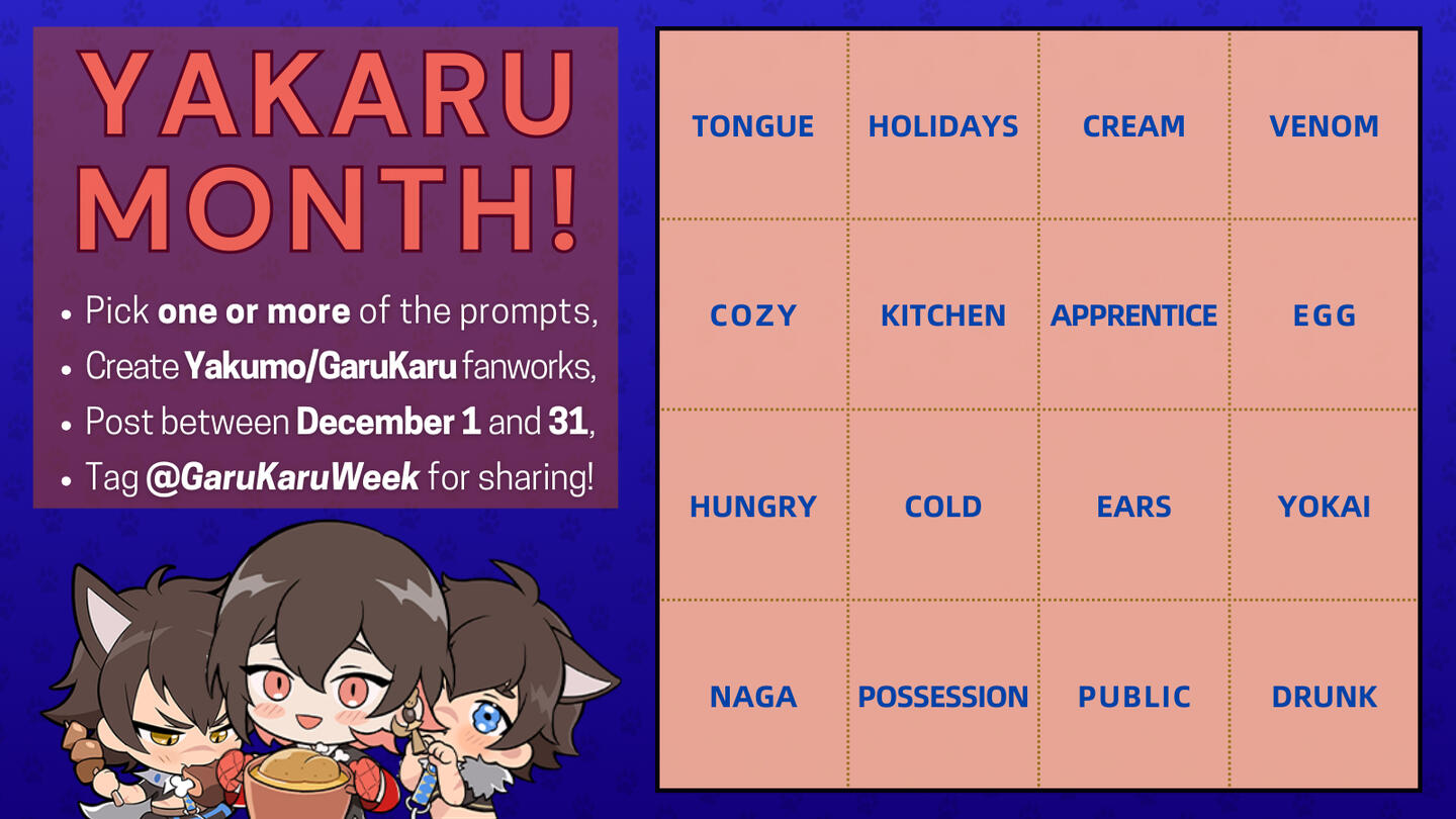 If none of the prompts inspire you, or you have an idea for a great GaruKaru fanwork that doesn't fit any of the prompts, consider posting for the 'Free Day!' prompt on November 29. That's the wildcard day for all such cases.