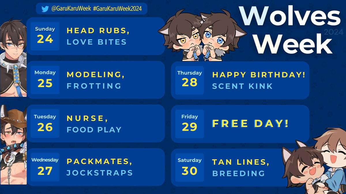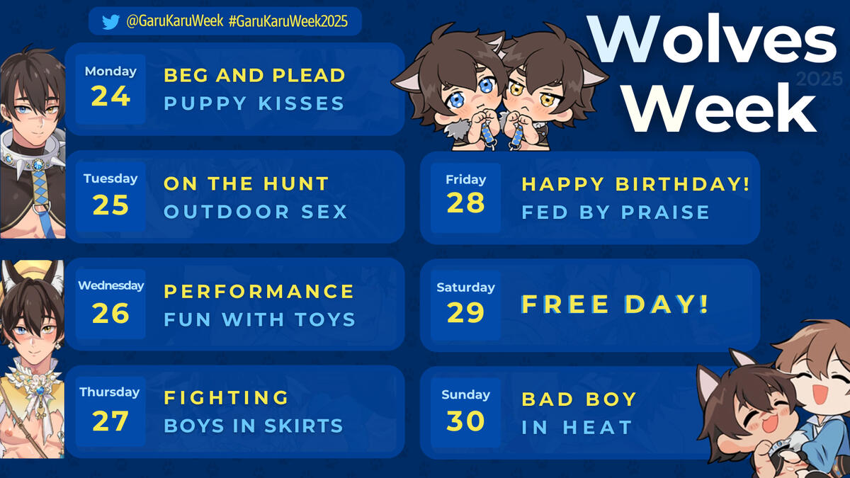 We're a rabid pack of fans with a mission to promote content and organize events around the goodest of gacha wolf boyes.Our activities began in late 2023 with the first birthday fanweek, which came back in 2024 and will happen again in 2025. We also ran twelve ship months for all the different GaruKaru pairings, based on whose birthday it was that month! Currently, our focus is on the 2025 birthday fanweek, but there are plans of running a gift exchange event in the future.Check out our links below for more info about events & the lists of fanworks that were inspired by our prompts.